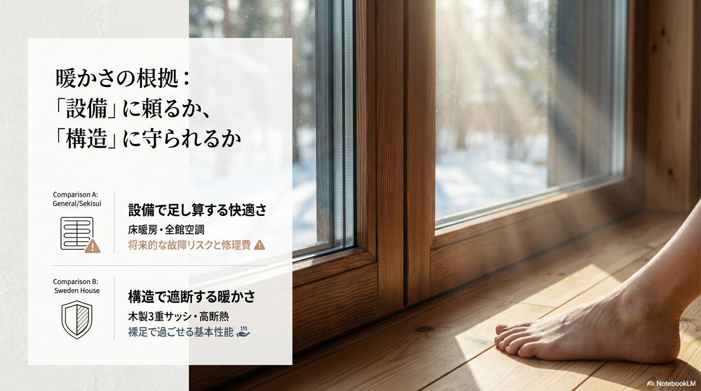 設備に頼る家は初期の快適性が高いものの、数十年後に床暖房などの機械が故障し、高額な修理費用がかかるリスクを伴います。