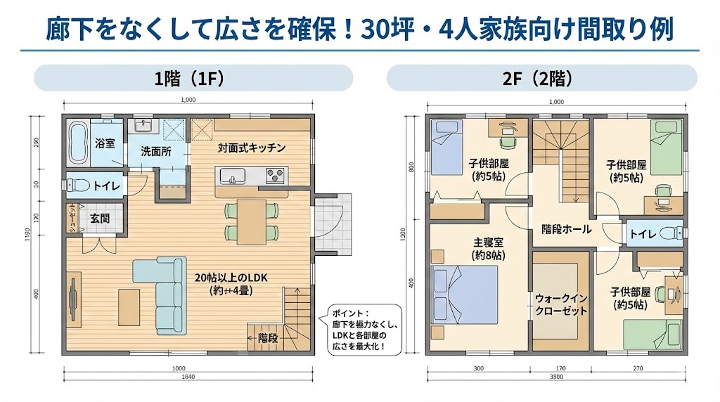 • 無駄な廊下を極力なくす: 廊下を居住スペースに組み込むことで、同じ30坪でも20帖以上の広々としたLDK(リビング・ダイニング・キッチン)を実現できます。