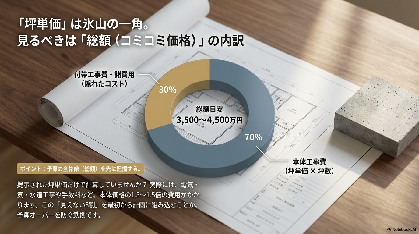 • 坪単価は氷山の一角。付帯工事や諸経費を含めた「総額」での資金計画が必須であること。