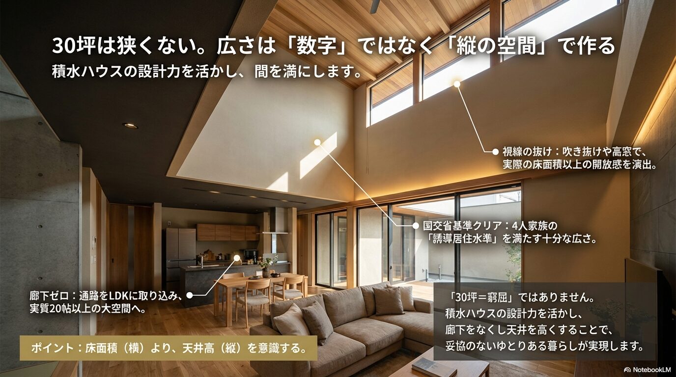 広さは「数字」ではなく「設計の工夫」でカバー可能です。積水ハウスの優れた設計力を活かせば、30坪でも決して妥協を感じない、ゆとりある暮らしが叶えられます。