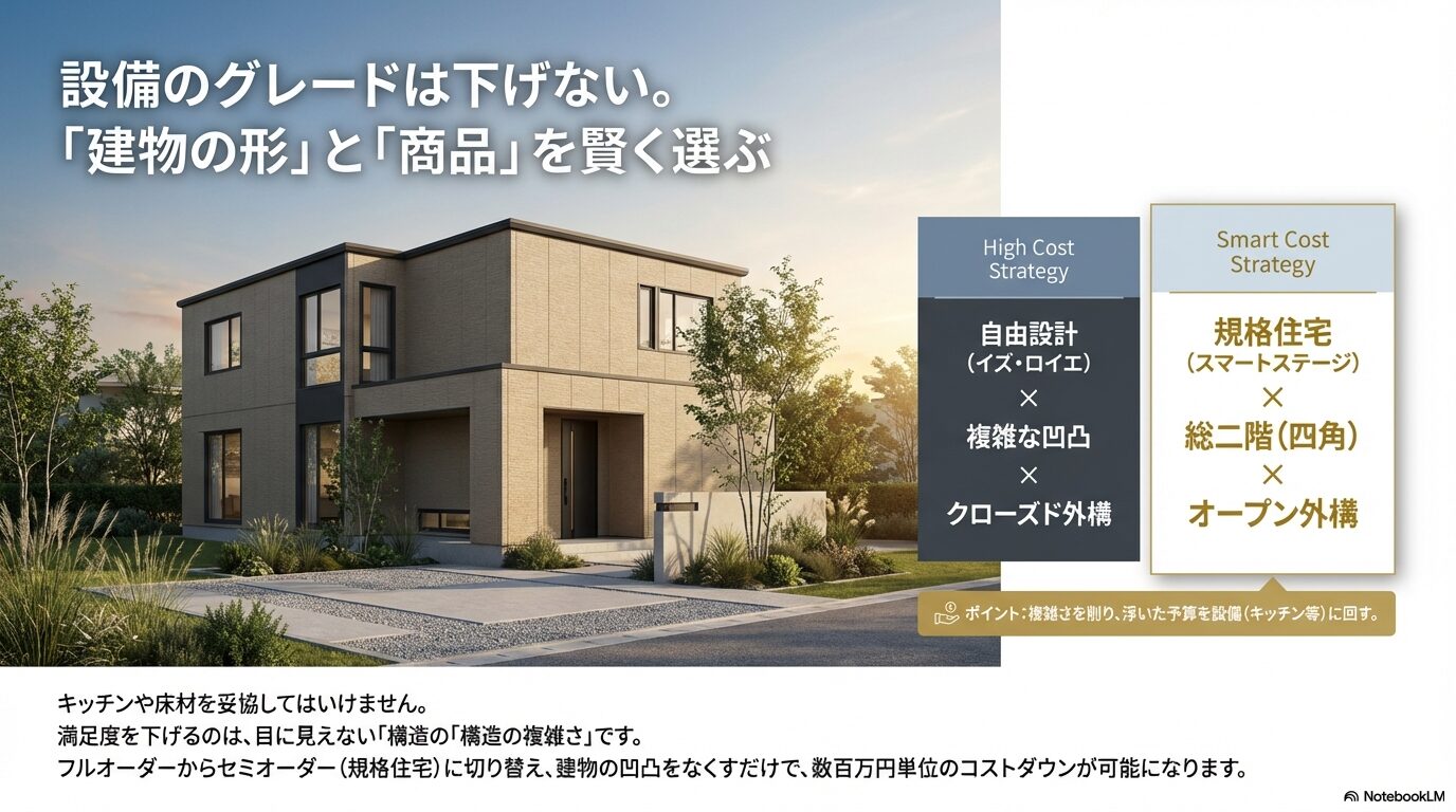 【結論】: 予算オーバーの際は、設備のグレードダウンではなく、「建物の形状」や「商品の選び方(規格住宅)」から見直してください。