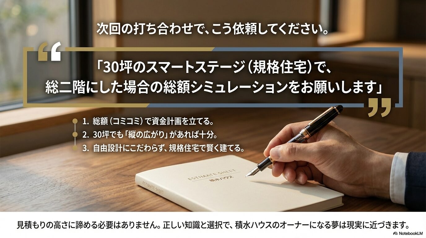 次回の打ち合わせでは、「30坪の規格住宅で、総二階にした場合の総額シミュレーションを出してほしい」と、自信を持って営業担当者に依頼してみてください。正確な知識に基づく交渉が、理想のマイホームへの道を確実に切り拓いてくれるでしょう。